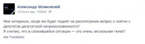 Многолетний вратарь и капитан киевского "Динамо" Александр Шовковский довольно активно проявляет свою гражданскую позицию. На персональной странице в социальной сети Facebook Шовковский предложил властям рассмотреть закон о снятии депутатской неприкосновенности: "Мне интересно, когда же будет поднят на рассмотрение вопрос о снятии с депутатов депутатский неприкосновенности? Я считаю, что в сложившейся ситуации - это очень актуальная тема!!!"