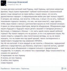 Александр Шовковский написал целое письмо на своей страничке и Интернете, посвященное событиям в Украине: