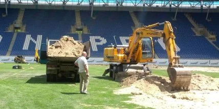 В минувшие выходные на поле "Днепр-Арены" начались ремонтные работы. Люди и техника принялись трудиться с места в карьер, сразу задав высокий темп и намереваясь работать без выходных.