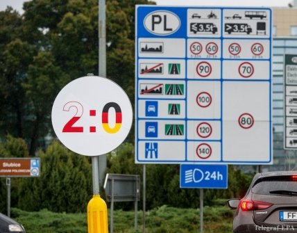 На фоне того, что немцы чемпионы мира победа полякам далась в неимоверной эйфории. Поляки до сих пор не могут отойти от этой радости. Вот на днях на польских дорогах появились такие вот наклейки на дорожных знаках.