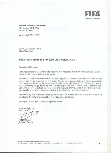 Федерация футбола Украины получила письмо от ФИФА, в котором международная футбольная ассоциация принесла свои извинения по поводу инцидента, который произошел во время презентации эмблемы Кубка Мира ФИФА-2018 в Москве, сообщается на официальном сайте организации. Ниже приводим его содержание: