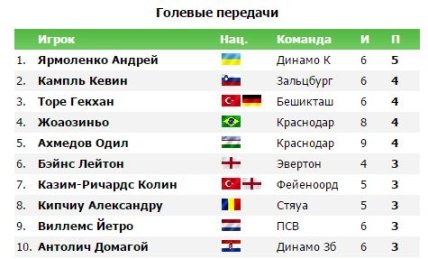 А вот лучшим ассистентом групповой стадии Лиги Европы УЕФА стал украинец Андрей Ярмоленко - 5 голевых передач за 6 матчей. На втором месте по количеству пасов стал игрок того же "Зальцбурга" Кевин Кампль.