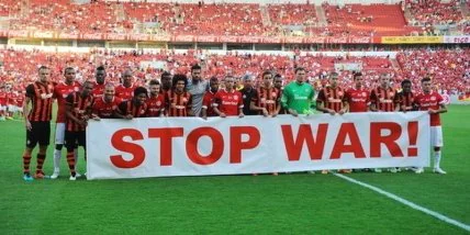 Донецкий "Шахтер" вышел на товарищеский матч с "Интернасьоналом" с баннером, призывающим остановить военный конфликт на востоке Украины. Баннер гласил "Стоп, война!" Стоит отметить, что футболисты бразильского клуба также присоединились к призыву остановить кровопролитие.