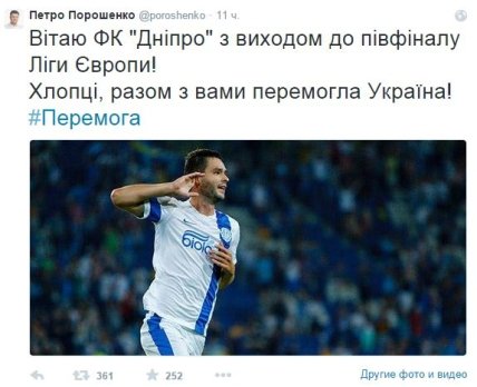 Об этом глава государства написал в своем "Твиттере": "Вітаю ФК "Дніпро" з виходом до півфіналу Ліги Європи! Хлопці, разом з Вами перемогла Україна!"