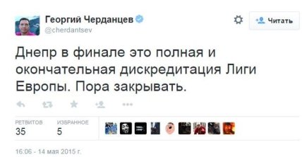 Российский спортивный комментатор Георгий Черданцев после выхода украинской футбольной команды "Днепр" в финал Лиги Европы, написал в своем Твиттере, что это победа ничто иное как дискредитация Лиги Европы.