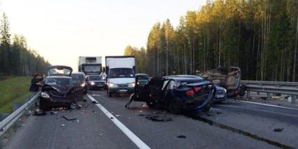 Утром в субботу 12 сентября седан Audi двигаясь по встречной полосе автодороги столкнулся с автомобилями KIA, Skoda, Subaru Forester, Лада.