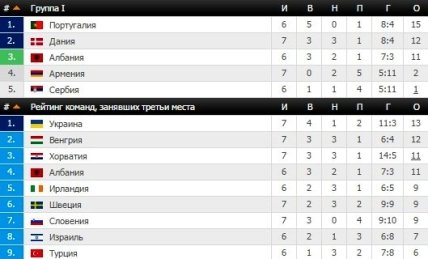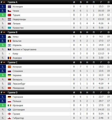 Турнирные таблицы отборочных групп на Евро-2016 (перед матчами 8 октября)