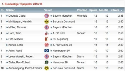 Полузащитник "Баварии" Дуглас Коста получил среднюю оценку 2,38 в чемпионате и стал лучшим игроком первого круга Бундеслиги, хавбек Боруссии Генрих Мхитарян набрал средний балл 2,50 и занял второе место.
