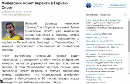 Агент украинского нападающего Артема Милевского Александр Панков в Іnstagram прокомментировал информацию относительно возможного трансфера футболиста в клуб первой лиги Украины – "Горняк-Спорт".