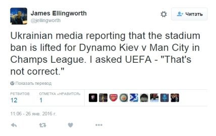 "Украинские СМИ распространили информацию, согласно которой дисквалификация стадиона на матче "Динамо" – "Манчестер Сити" отменена. В УЕФА мне ответили: "Это не соответствует действительности", – написал Эллингуорт в "Твиттере".