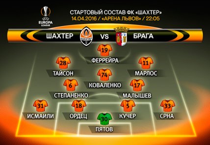 "Шахтер": Пятов, Кучер, Степаненко, Марлос, Малышев, Ордец, Феррейра, Тайсон, Исмаили, Срна, Коваленко