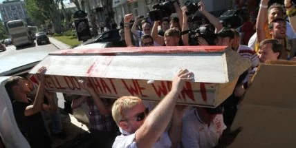 19 июня в центре Донецка английские болельщики провели небольшое шествие с гробом, который они привезли с собой из кемпинг-парка. Тем самым фаны выразили протест против необъективного освещения в Англии ситуации в Украине, а также против высказываний бывшего капитана сборной Англии С.Кэмпбелла, о том, что не нужно ехать в Украину, потому что там очень опасно.
