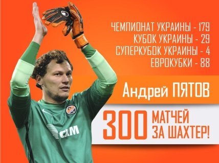 Сегодняшняя игра станет 300-й в составе  "Шахтера" для вратаря Горняков Андрея Пятова.