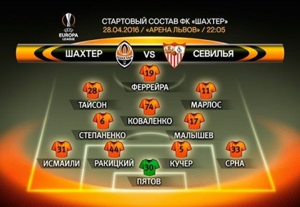 "Шахтер": Пятов, Кучер, Степаненко, Марлос, Малышев, Феррейра, Тайсон, Исмаили, Срна, Ракицкий, Коваленко