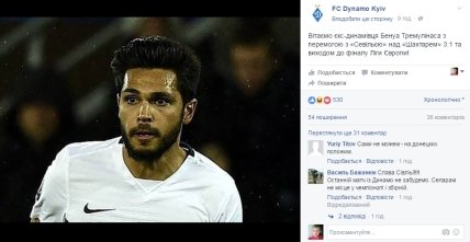 Футбольный клуб "Динамо" (Киев) поздравил своего бывшего игрока Бенуа Тремулинаса, выступающего за испанскую "Севилью", с победой над "Шахтером" и выходом в финал Лиги Европы на клубной страничке в Facebook.