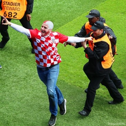 Праздновать гол сборной Хорватии также прибежал один из болельщиков, которого быстро увели стюарды