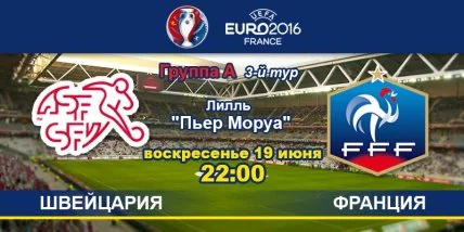 Сегодня, 19 июня, на чемпионате Европы пройдут первые матчи 3-го тура. В группе А сыграют лидеры квартета Швейцария и Франция. Швейцария ни разу не побеждала французов в официальных играх: В 5-и матчах 2 победы на счету трехцветных, трижды поединки завершались ничьей. Сборная Франции в двух стартовых встречах Евро-2016 одержала победу над Румынией и Албанией. Швейцарцы, в свою очередь, обыграли Албанию, а с румынами сыграли вничью.