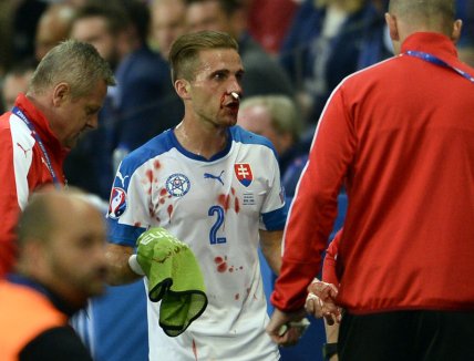 90'+ Мартин Шкртел (Словакия) просит помощи врачей жестами. Возможно, он получил серьезную травму.