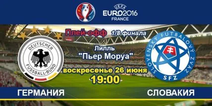 26 июня в Лилле, на стадионе "Пьер Моруа" в 1/8 финала Евро-2016 встретятся команды Германии и Словакии. Игра начнется в 19:00 по киевскому времени. В 28-и встречах между командами Германия одержала 17 побед, 5 раз была зафиксирована ничья, 6 побед на счету словаков. В плей-офф Евро-2016 немцы вышли с 1-го места в группе С, Словакия попала в число лучших 3-х команд.