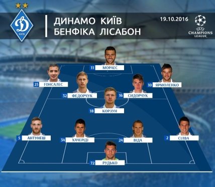 "Динамо": Рудько, Данило Силва, Хачериди, Вида, Антунеш, Корзун, Ярмоленко, Федорчук, Сидорчук, Гонсалес, Мораеш.