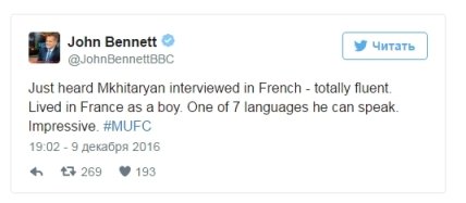 "Только-что слышал, как Мхитарян дает интервью на французском языке. Совершенно свободно. Это один из 7 языков, которыми он владеет. Впечатляет", – написал Джон Беннет из ВВС.