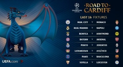 Манчестер Сити - Монако, Реал Мадрид - Наполи, Бенфика - Боруссия Дортмунд, Бавария - Арсенал, Порту - Ювентус, Байер - Атлетико Мадрид, ПСЖ - Барселона, Севилья - Лестер.