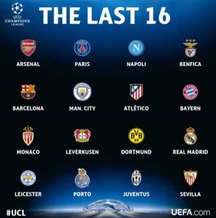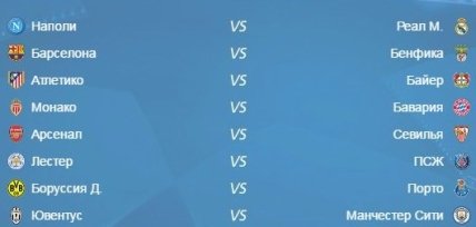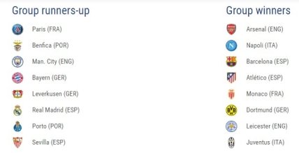 Корзина сеяных: "Арсенал" (Англия), "Наполи" (Италия), "Барселона" (Испания), "Атлетико" (Испания), "Монако" (Франция), "Лестер" (Англия), "Боруссия" Д (Германия), "Ювентус" (Италия).