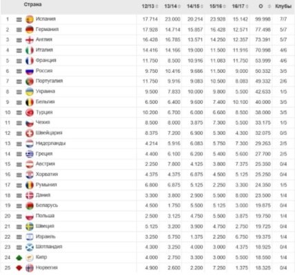 По итогам очередного сезона Украина набрала 27,5 очка, что дало 5,5 балла коэффициента в таблице рейтинга. Это худший суммарный показатель наших клубов за последние годы. Более того, в приведенном ниже скрине в крайней правой графе ошибочно указано, что у Украины в нынешнем евросезоне осталась одна из пяти команд, выходивших на старт. На самом деле все пять наших представителей уже завершили свои выступления на континентальной арене.