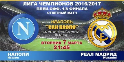 В первом матче в Мадриде "Реал" обыграл "Наполи" со счетом 3:1 и сегодня подопечным Маурицио Сарри, чтобы пройти в четвертьфинал нужно в домашних стенах одержать победу с разницей в два мяча.