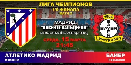 Прямая текстовая трансляция ответного матча 1/8 финала Лиги чемпионов "Атлетико" - "Байер".