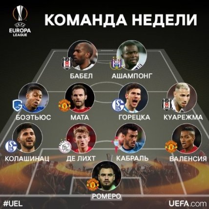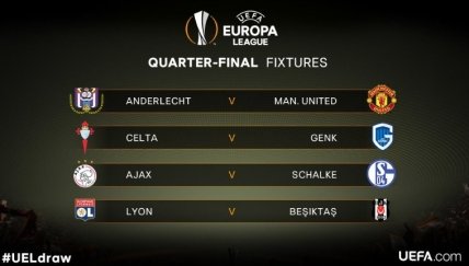 В четвертьфинальный раунд второго по престижности клубного турнира в Европе пробились: Бешикташ, Генк, Сельта, Андерлехт, Аякс, Шальке, Манчестер Юнайтед и Лион.