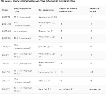 Выиграв чемпионат за четыре тура до его конца, Шахтер также повторил свой лучший результат в истории — ранее только в сезоне 2012/13 Горняки выигрывали золотые награды так рано, во всех остальных случаях интрига сохранялась гораздо дольше.