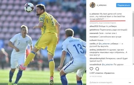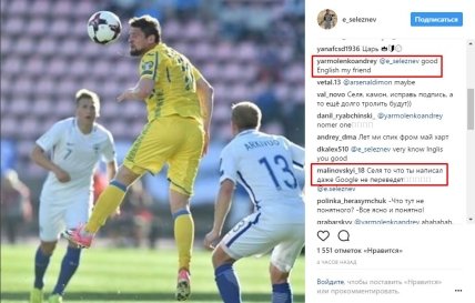 Нападающий сборной Украины Евгений Селезнев проявил свои незаурядные знания английского языка, прокомментировав в своем Инстаграме игру против Финляндии.