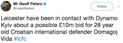 Журналист издания talkSPORT Джефф Питерс в своем Twitter заверил, что Лестер предложил Динамо 10 млн фунтов за 28-летнего защитника.