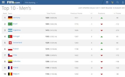 В топ-10 также произошли глобальные изменения. Все команды сменили позиции, а Испания покинула первую десятку. После победы на Кубке Конфедераций возглавляет рейтинг сборная Германии, которая поднялась на две строчки. В Топ-5 также вошли сборные Бразилии, Аргентины, Португалии и Швейцарии.