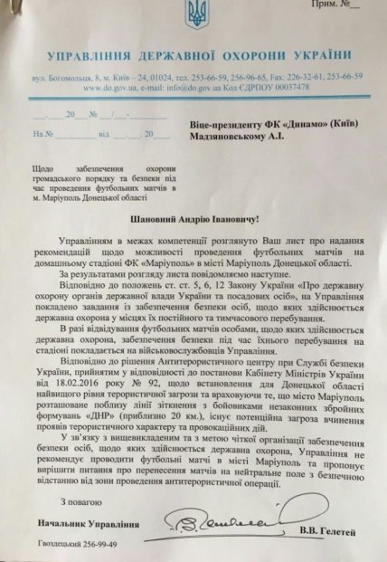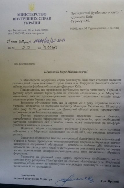 В письме отмечается, что уровень угрозы в Донецкой области оценивается как «красный», и это требует дополнительных мер безопасности, но лучшим выходом МВД видит перенос матча в другой город.