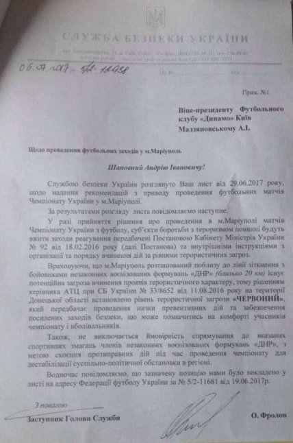 Подтверждает существование террористической угрозы и Служба безопасности Украины, а Управление государственной охраны Украины также предлагает перенести матч в другой город на безопасное расстояние.