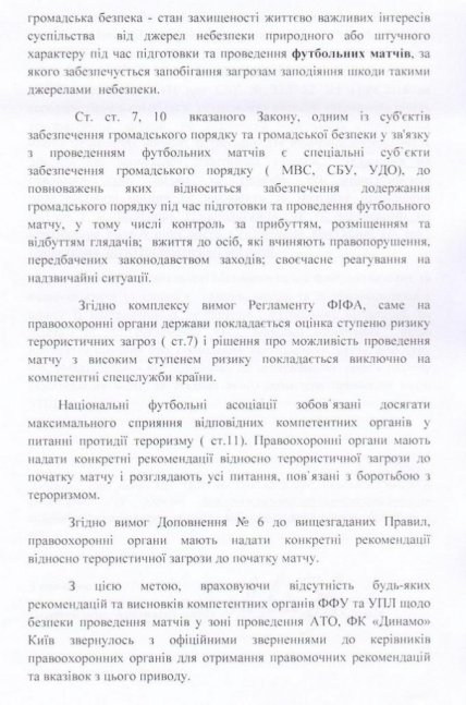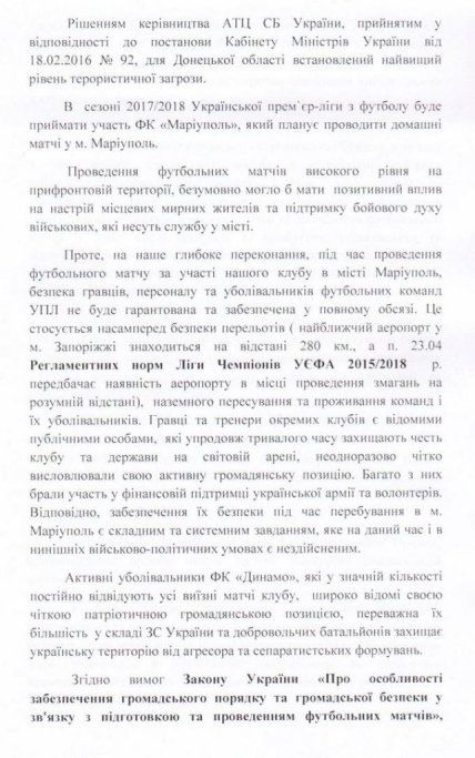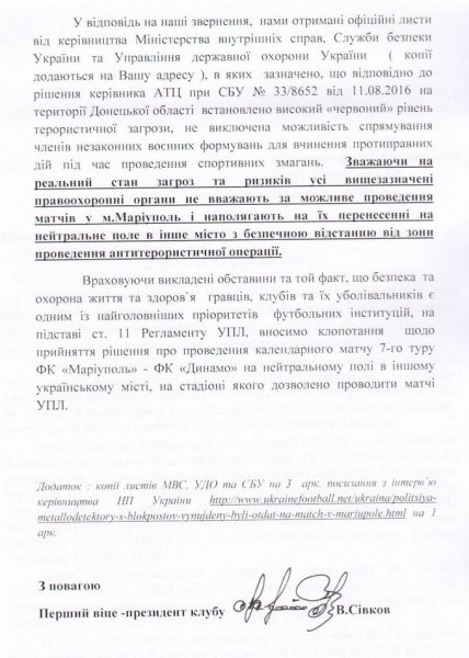 "Учитывая тот факт, что безопасность и охрана жизни и здоровья игроков, клубов и их болельщиков является одним из главных приоритетов футбольных институтов, на основании ст. 11 Регламента УПЛ, вносим ходатайство о принятии решения о проведении календарного матча 7-го тура ФК Мариуполь – ФК Динамо на нейтральном поле в другом украинском городе, на стадионе которого разрешено проводить матчи УПЛ", – говорится в заявлении ФК Динамо.