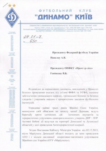 Письмо, направленное к президентам УПЛ и ФФУ, Владимиру Генинсону и Андрею Павелко соответственно, Динамо обнародовало на своем официальном сайте.