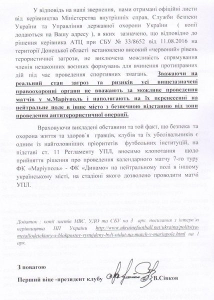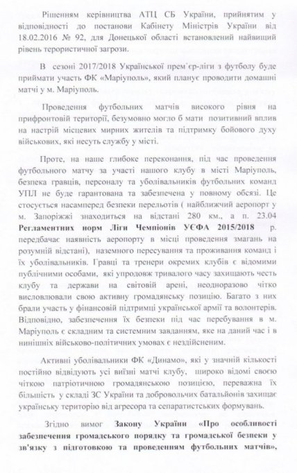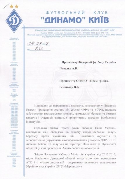 В открытом письме к президенту ФФУ Андрею Павелко и президенту УПЛ Владимиру Генинсону Динамо описывает причины, которые заставляют клуб просить о переносе выездной игры против Мариуполя из этого города на нейтральное поле.