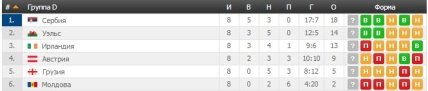 Отметим, что в данный момент Уэльс занимает второе место в группе D, отставая от лидирующей Сербии на 4 очка.