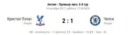 В матче 8-го тура английской Премьер-лиги «Челси» в гостях сенсационно проиграл «Кристал Пэлас» (1:2), который начал сезон с восьми кряду поражений и только сегодня забил первый гол в текущем первенстве.