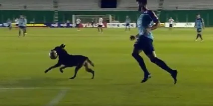 В матче чемпионата Боливии Блуминг – Насьональ Потоси состоялся забавный инцидент с участием пса, сбежавшего от своего инструктора, который отвечал за безопасность на стадионе.