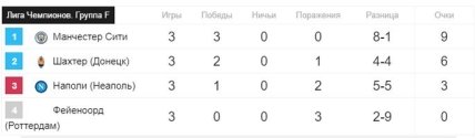 Ситуация в группе F: 1. Манчестер Сити - 12, 2. Шахтер - 9, 3. Наполи - 3, 4. Фейенооорд - 0.