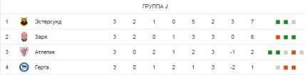 Поражение Зари, но шансы на выход из группы есть. Ситуация в группе после матча: 1. Эстерсунд - 7, 2. Заря - 6, 3. Атлетик - 5, 4. Герта - 4.