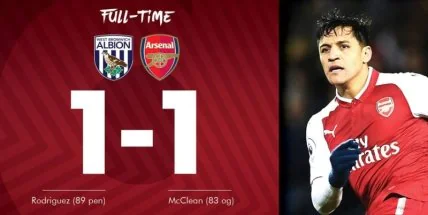В поединке 21-го тура Английской Премьер-лиги «Вест Бромвич» и «Арсенал» сыграли вничью со счетом 1:1.