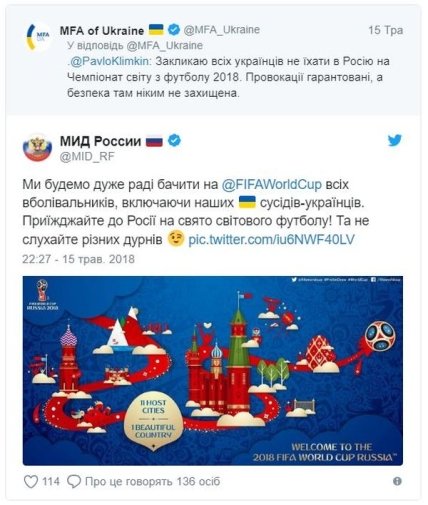 Министр иностранных дел Украины Павел Климкин прокомментировал сообщение МИД России в twitter с призывом к украинцам посетить чемпионат мира 2018 года. Напомним, на днях МИД Украины призвал соотечественников отказаться от поезди на ЧМ-2018 в России. В ответ российская сторона обратилась к болельщикам на украинском языке.
