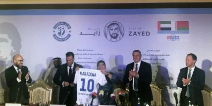 Председатель правления брестского Динамо Диего Марадона дал первую пресс-конференцию в новой должности. Мероприятие прошло в Emirates Palace Hotel (Абу-Даби).