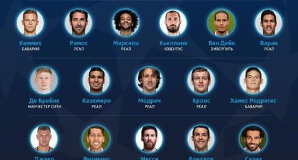 Защитники: Йосуа Киммих (Бавария), Серхио Рамос, Марсело, Рафаэль Варан (все – Реал), Вирджил ван Дейк (Ливерпуль), Джорджо Кьеллини (Ювентус).