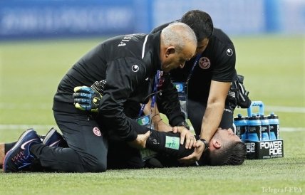 6' - Пауза в игре - вратарю Туниса нужна помощь.
